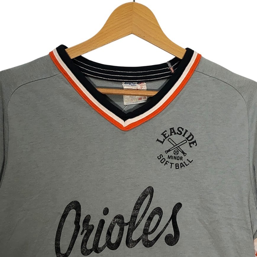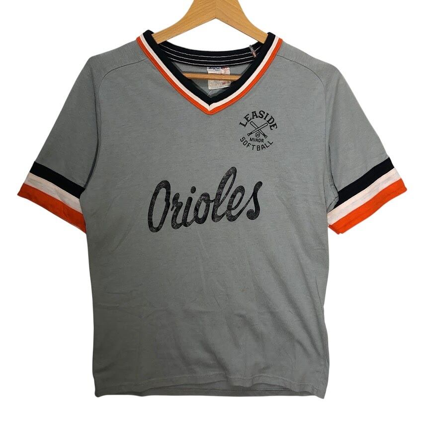 商品名:90's vintage Athletic Knit Leaside Minor Softball ソフトボール チーム 8 スポーツ リンガーシャツ 半袖 Tシャツ フロントバックプリント ワンポイントプリント ジャージ Canada製 Sサイズ グレー