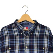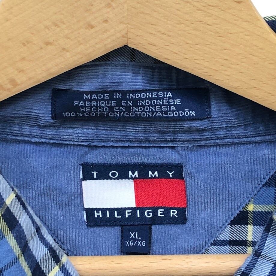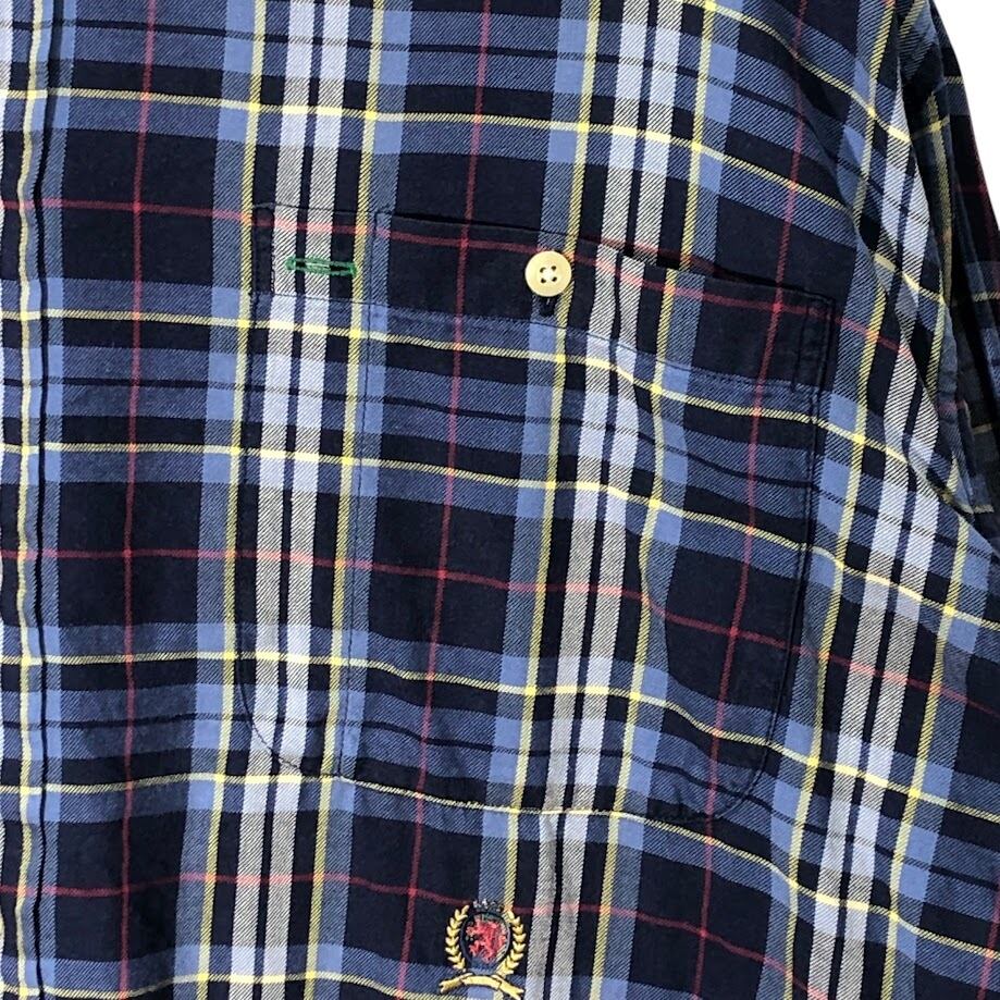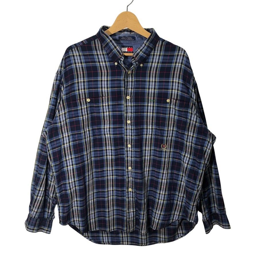 90's vintage 90年代 ヴィンテージ TOMMY HILFIGER トミーヒルフィガー チェック柄 チェックシャツ 長袖 シャツ ボタンダウン ワンポイントロゴ刺繡 オーバーサイズ インドネシア製 XLサイズ ネイビー ブルー