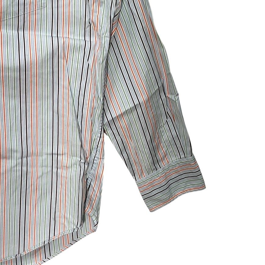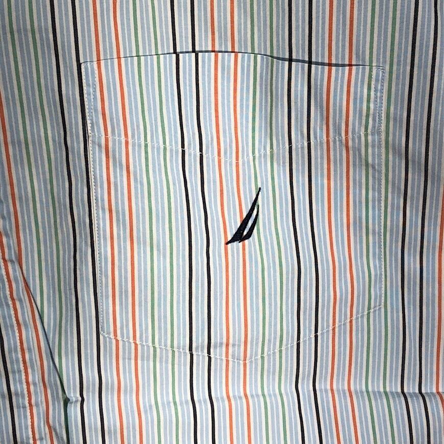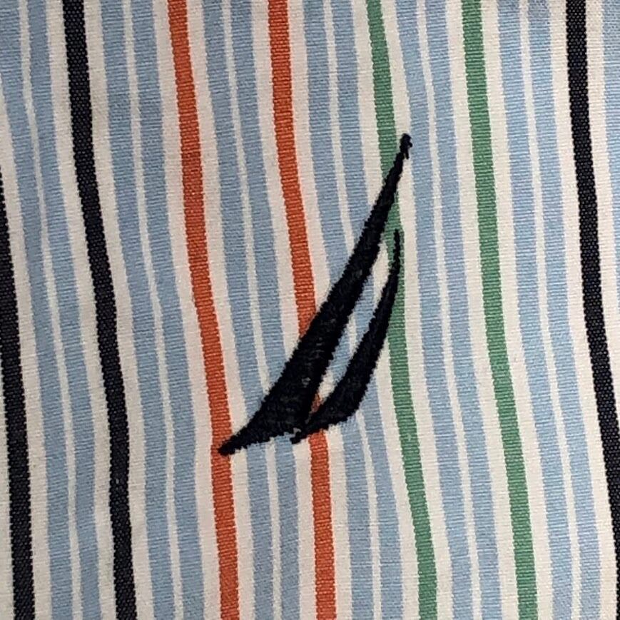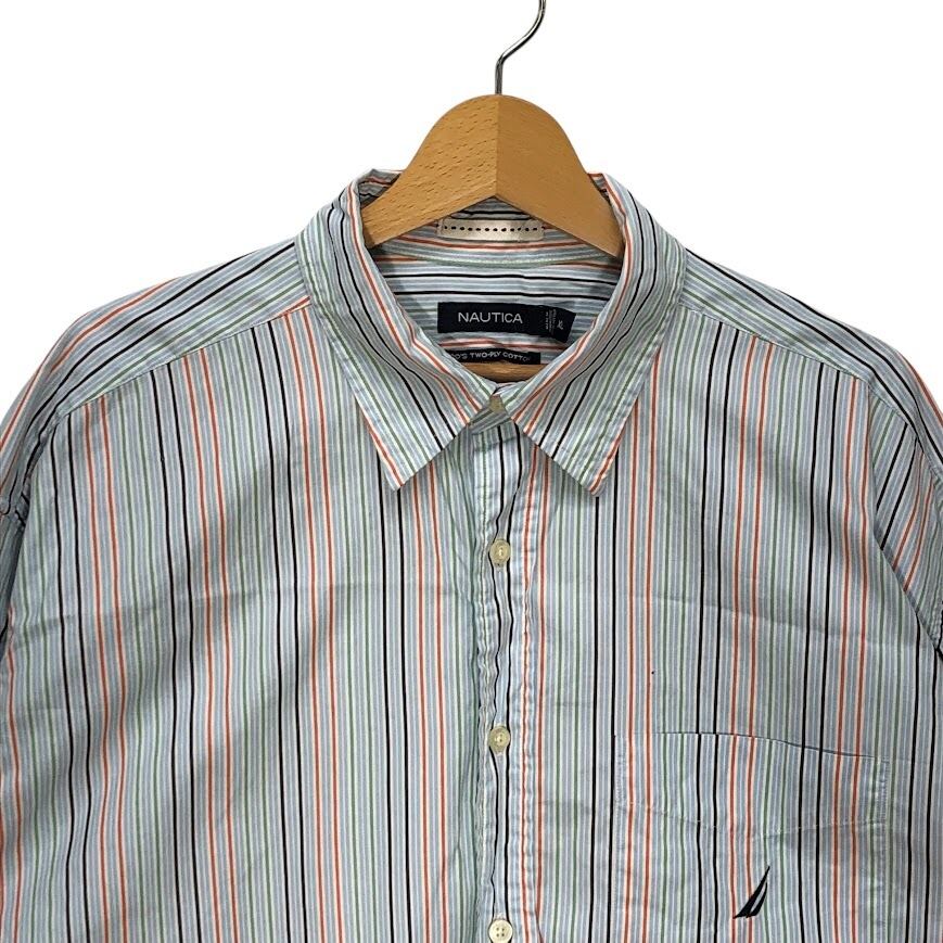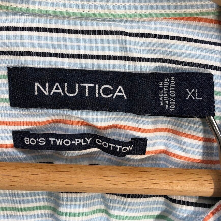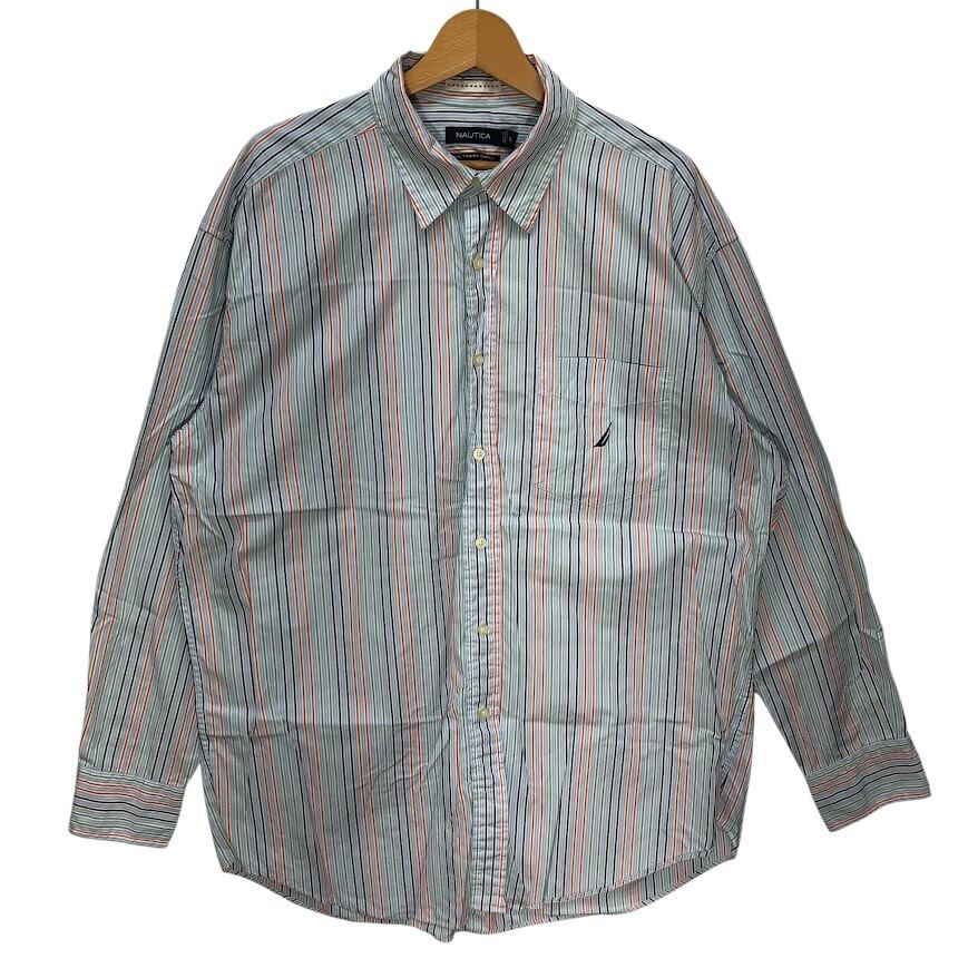 NAUTICA ノーティカ 80's TWO-PLY COTTON 胸ポケット 長袖シャツ ストライプ柄 ワンポイント刺繡 オーバーサイズ ビッグシルエット MAURITIUS製 XLサイズ ライトブルー マルチカラー