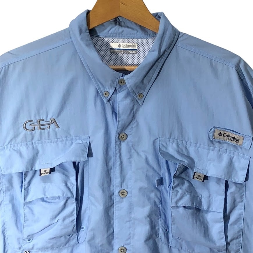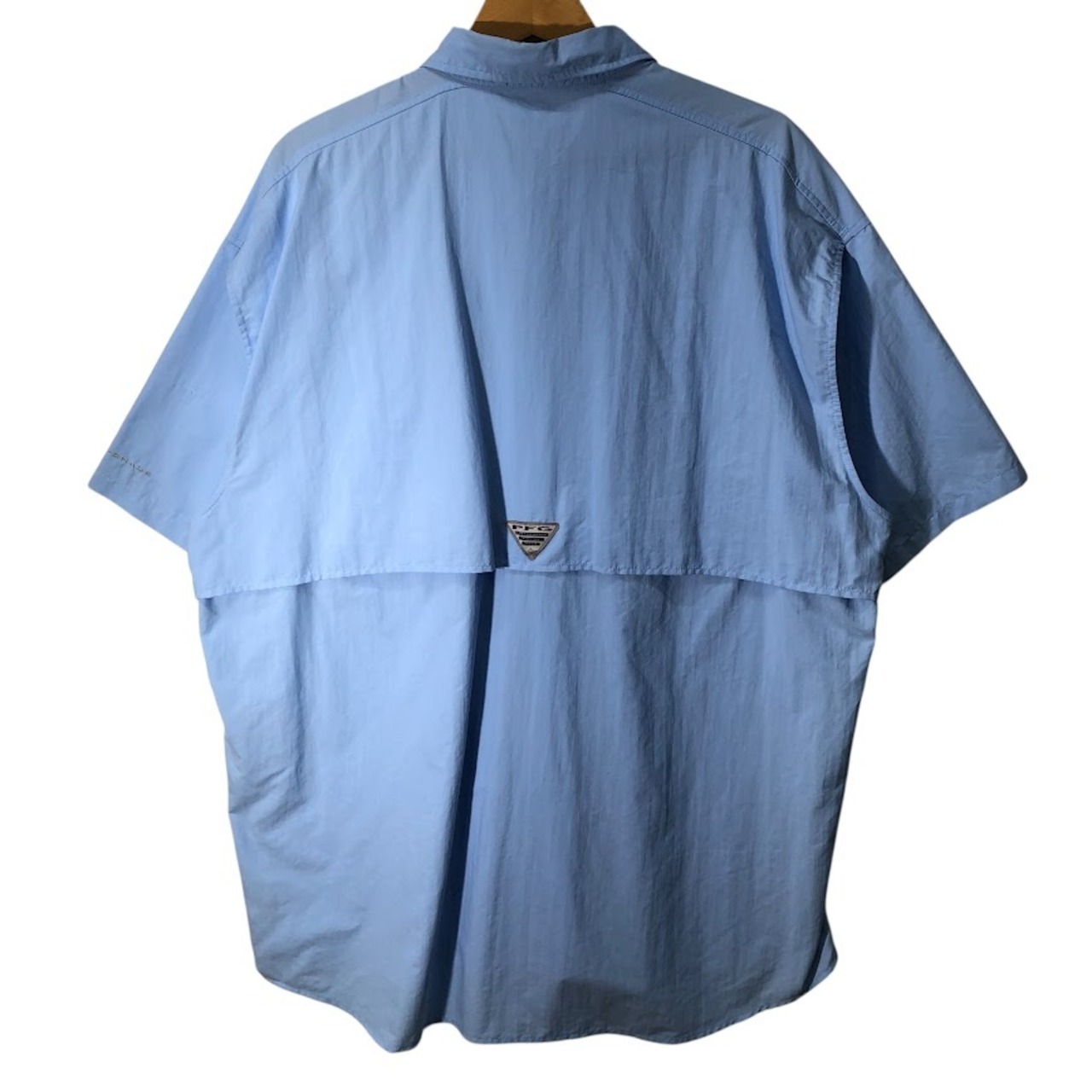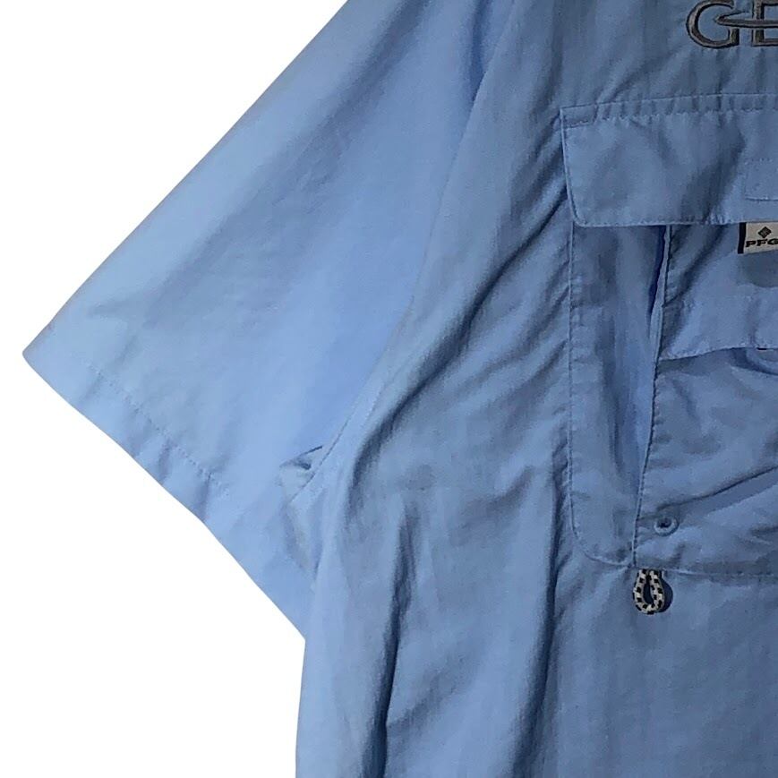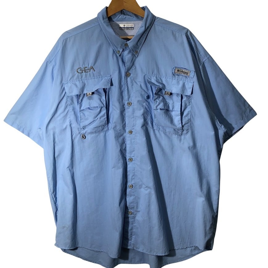 Columbia/コロンビア PFG フィッシングシャツ アウトドア 企業ロゴ刺繡 半袖シャツ ボタンダウン オーバーサイズ ベトナム製 XLサイズ スカイブルー