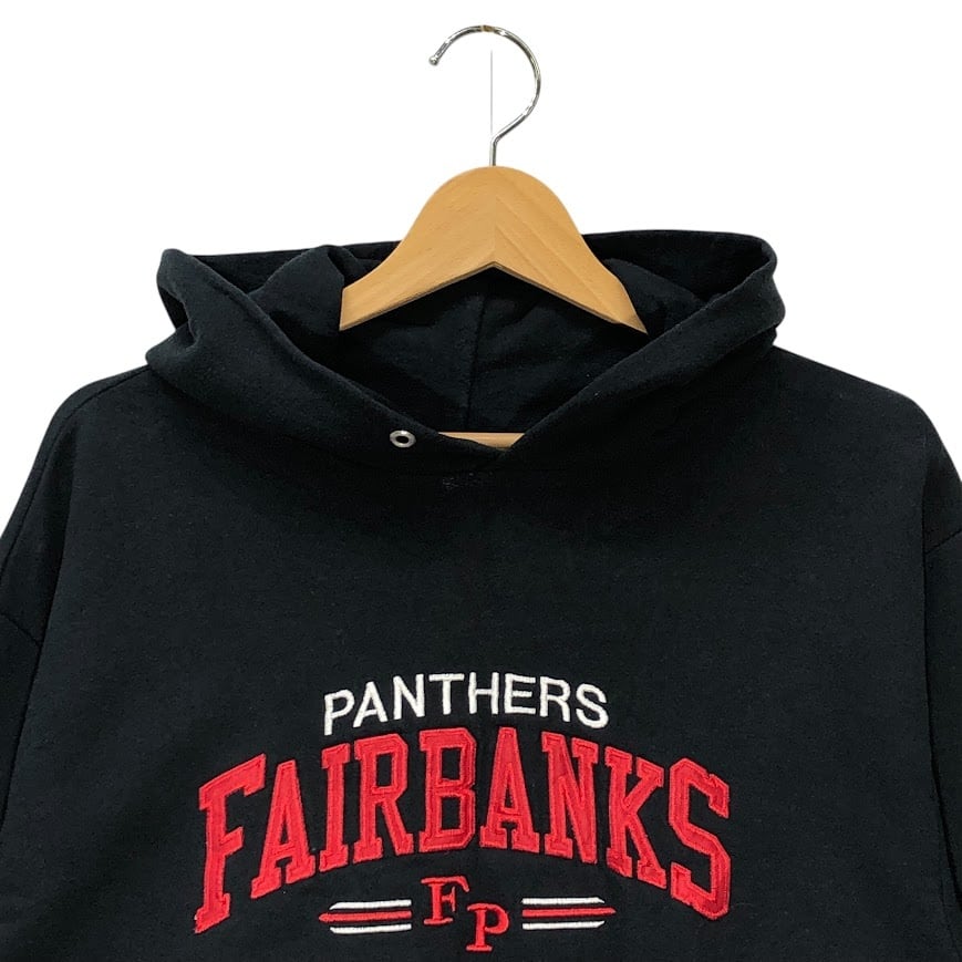 商品名:90~00's vintage 90~00年代ヴィンテージ JERZEES ジャージーズ フェアバンクス パンサーズ チーム カレッジロゴ刺繡 パーカー フーディー フロント刺繡 ドミニカ製 Mサイズ ブラック