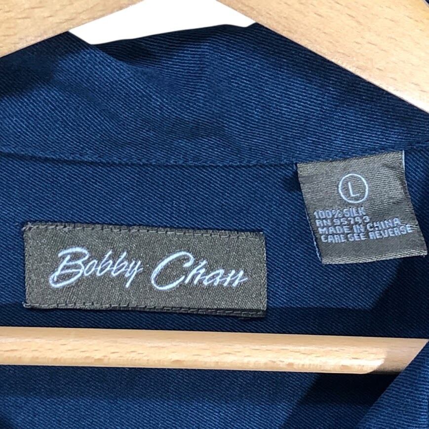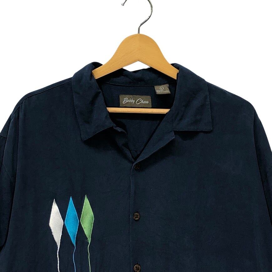 Bobby Chan オープンカラーシャツ シルクシャツ 半袖シャツ フロント刺繍 China製 Lサイズ ネイビー