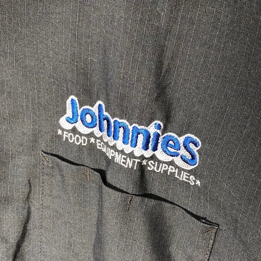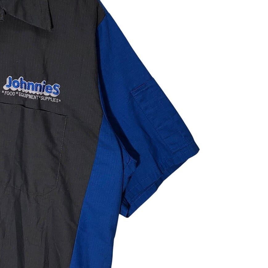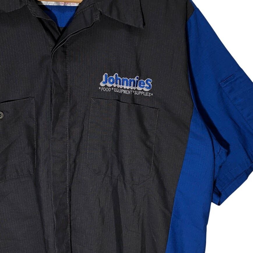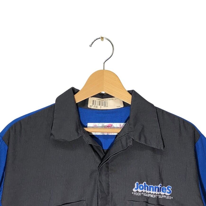 ヴィンテージ RED KAP レッドキャップ ワークシャツ Johnnies オープンカラーシャツ 開襟シャツ バイカラー 半袖 シャツ ボタンダウン 企業ロゴ刺繡 オーバーサイズ ビッグシルエット ホンジュラス製 L-SSサイズ グレー ブルー
