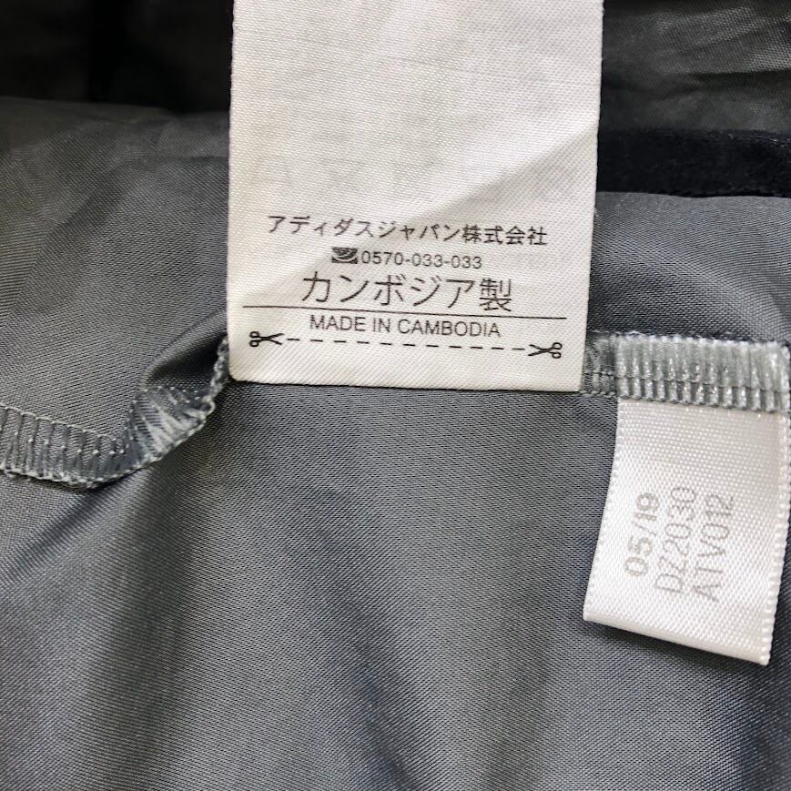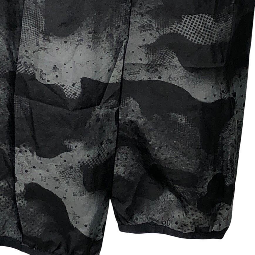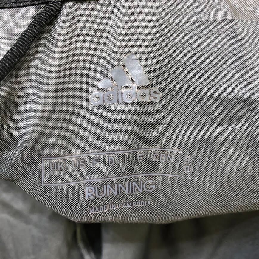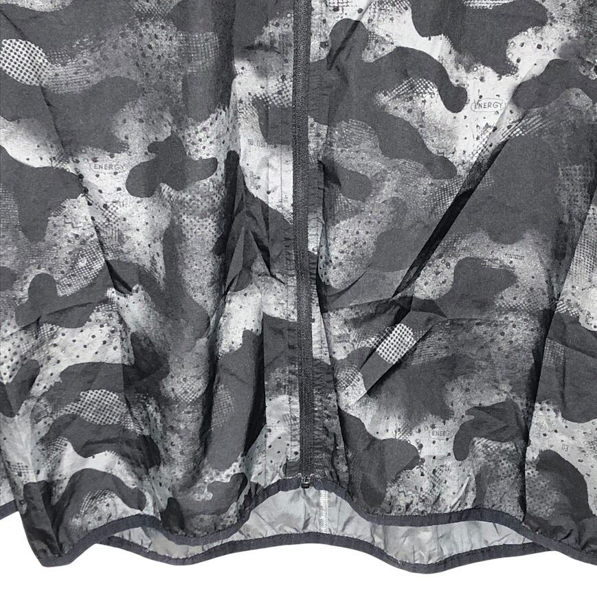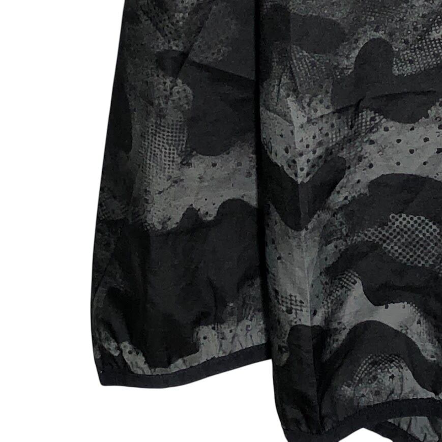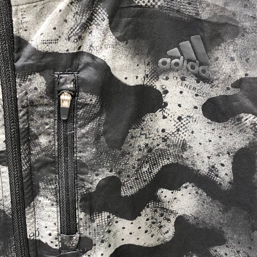 商品名:adidas/アディダス running カモ柄 ナイロンジャケット 総柄 レインウェア フード ライトアウター フロントバックプリント オーバーサイズ カンボジア製 ブラック/グレー
