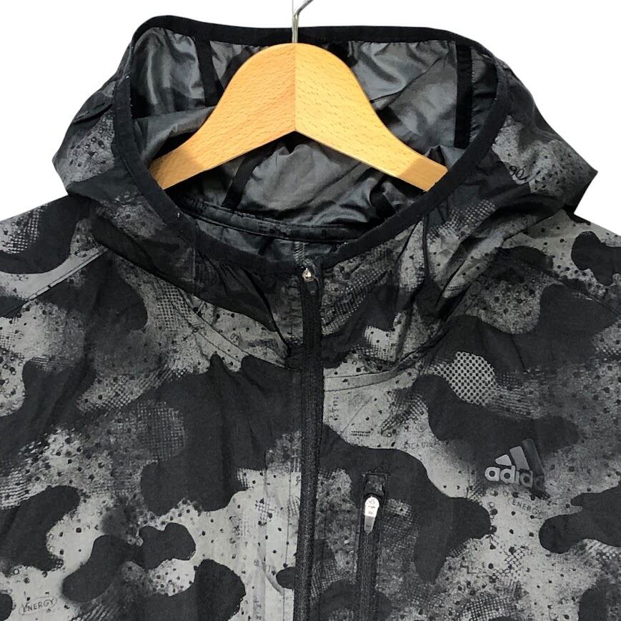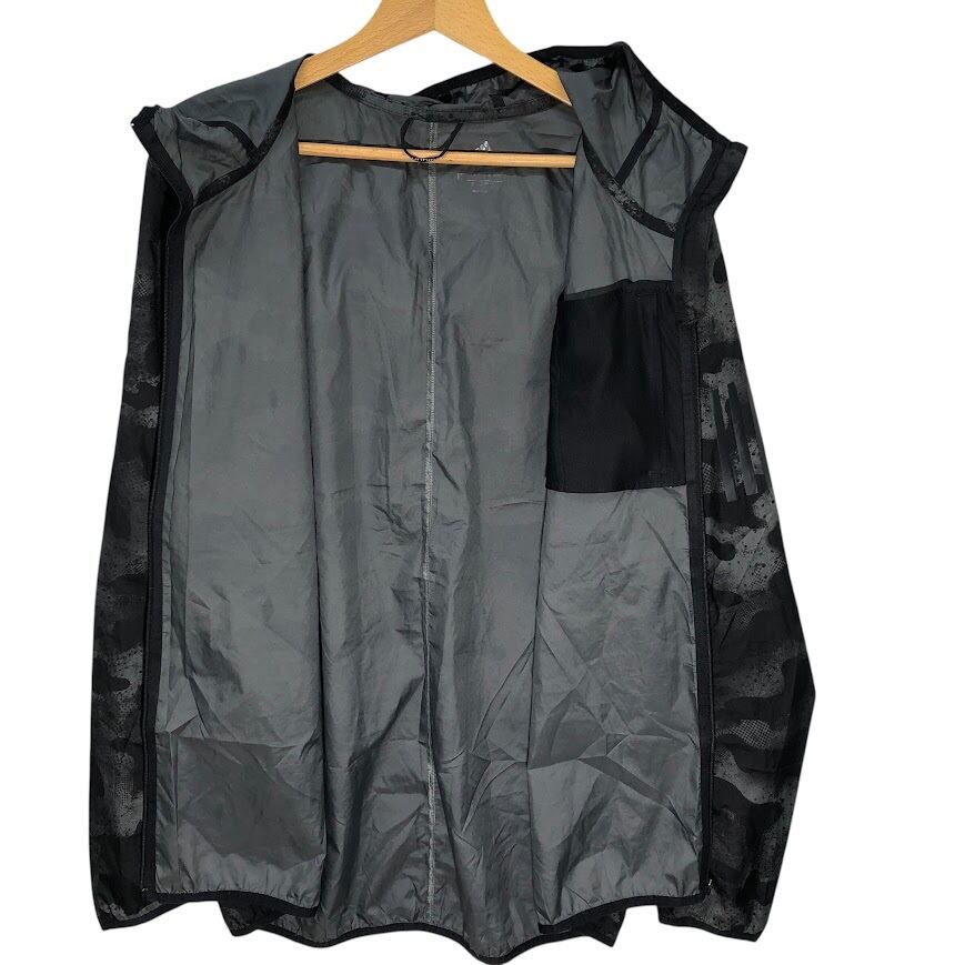 adidas/アディダス running カモ柄 ナイロンジャケット 総柄 レインウェア フード ライトアウター フロントバックプリント オーバーサイズ カンボジア製 ブラック/グレー