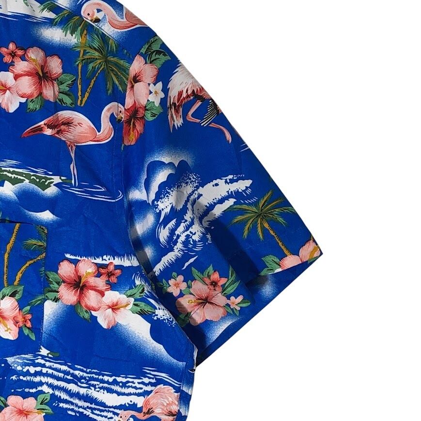 Xi Peng アロハシャツ 総柄 US古着 ピンクフラミンゴ ヤシの木 半袖 シャツ ボタンダウン CHINA製 Lサイズ ブルー