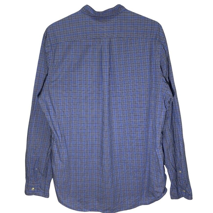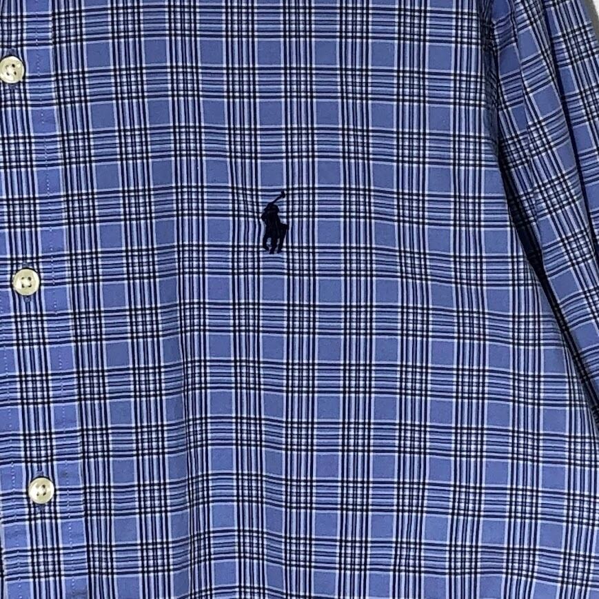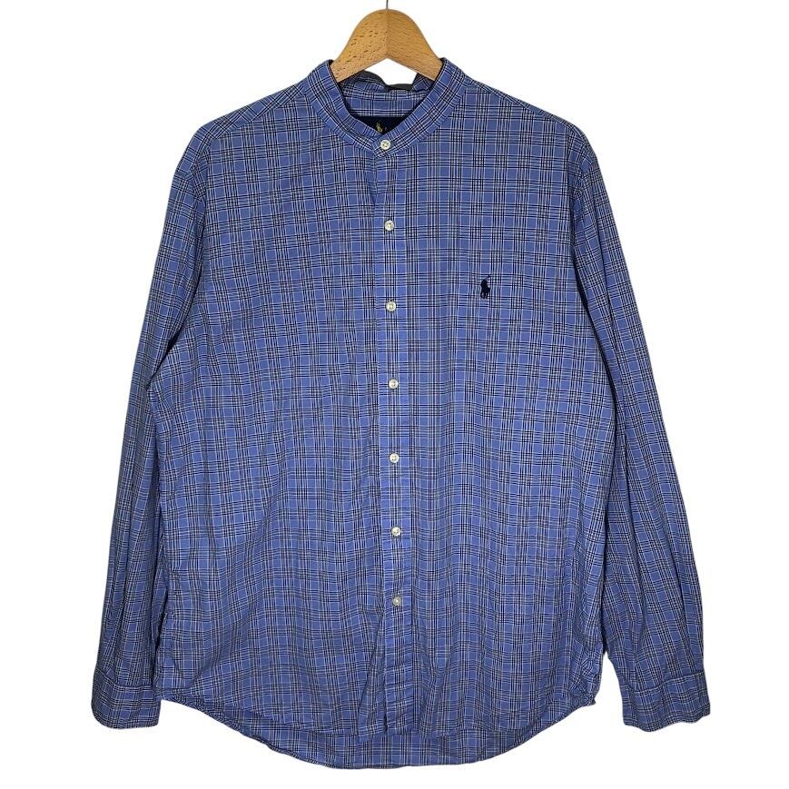 RALPH LAUREN /ラルフローレン ノーカラーチェックシャツ ポニー刺繡 長袖シャツ ボタンダウン オーバーサイズ ビッグシルエット China製 Lサイズ ライトブルー