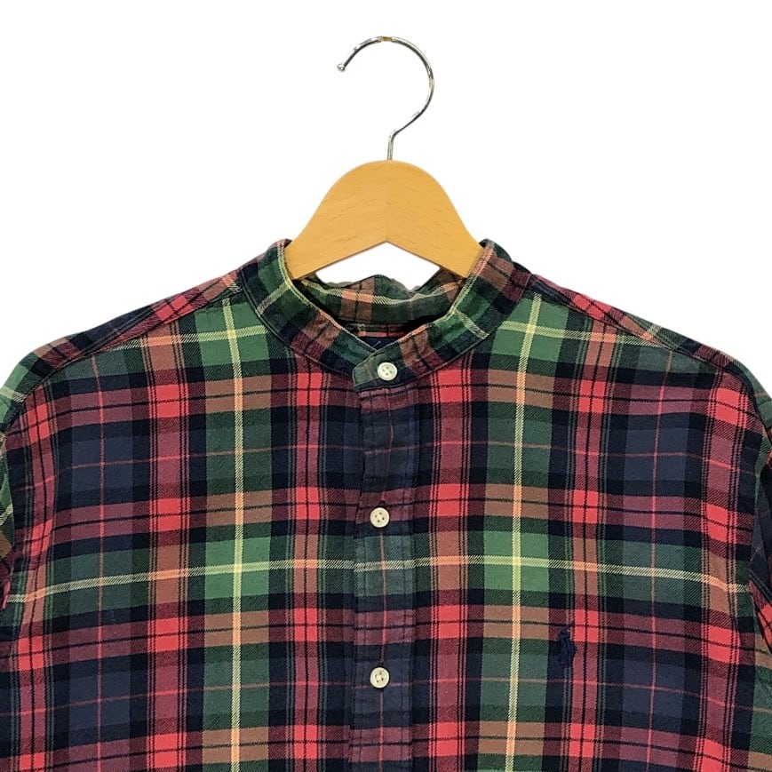 商品名:90's vintage 90年代 ヴィンテージ Ralph Lauren ラルフローレン ノーカラーシャツ ポニー刺繡 チェック柄 長袖シャツ ワンポイント刺繍 インド製 Mサイズ レッド ネイビー グリーン