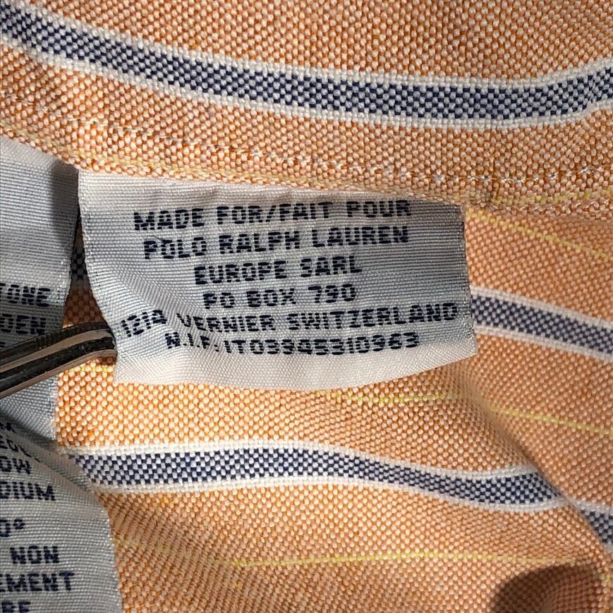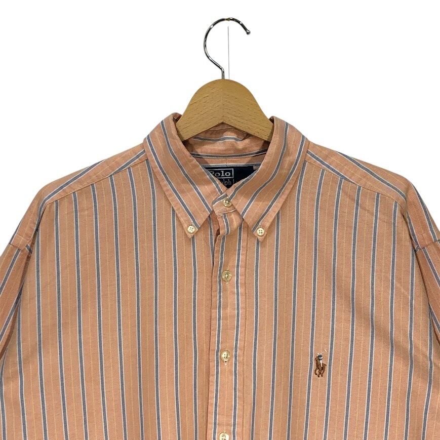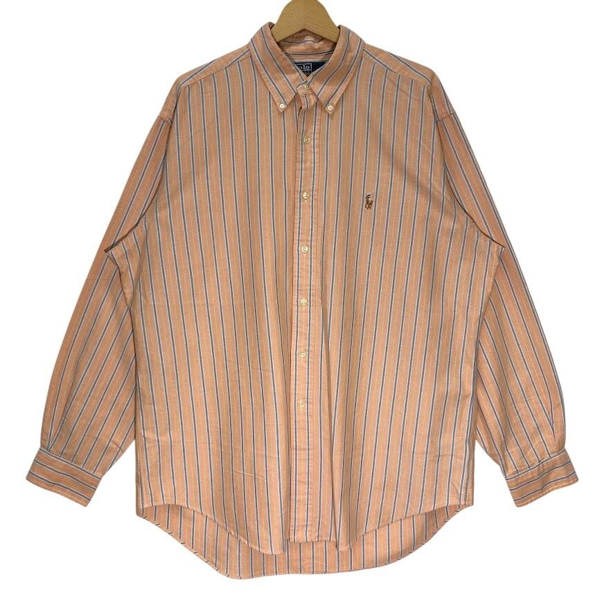 商品名:90's vintage Polo by Ralph Lauren ポロバイラルフローレン CLASSIC FIT ストライプ柄 ポニー刺繡 長袖シャツ ボタンダウン オーバーサイズ HongKong製 16 1/2-42 Lサイズ サーモンピンク オレンジ