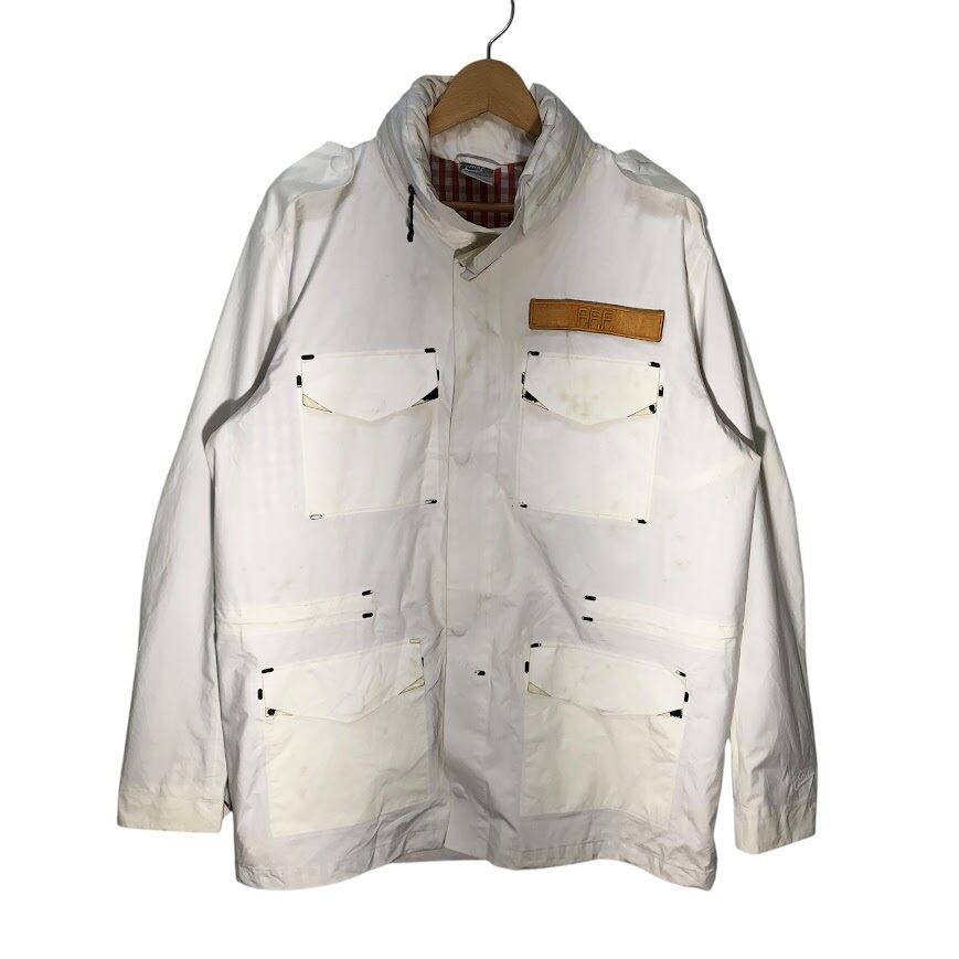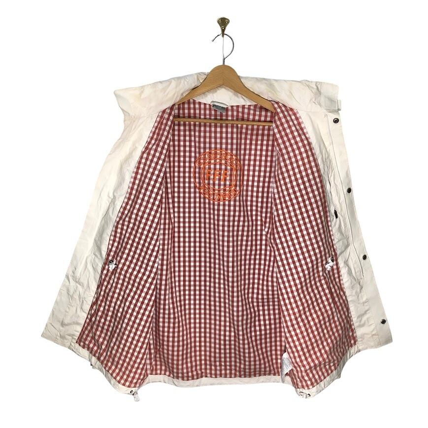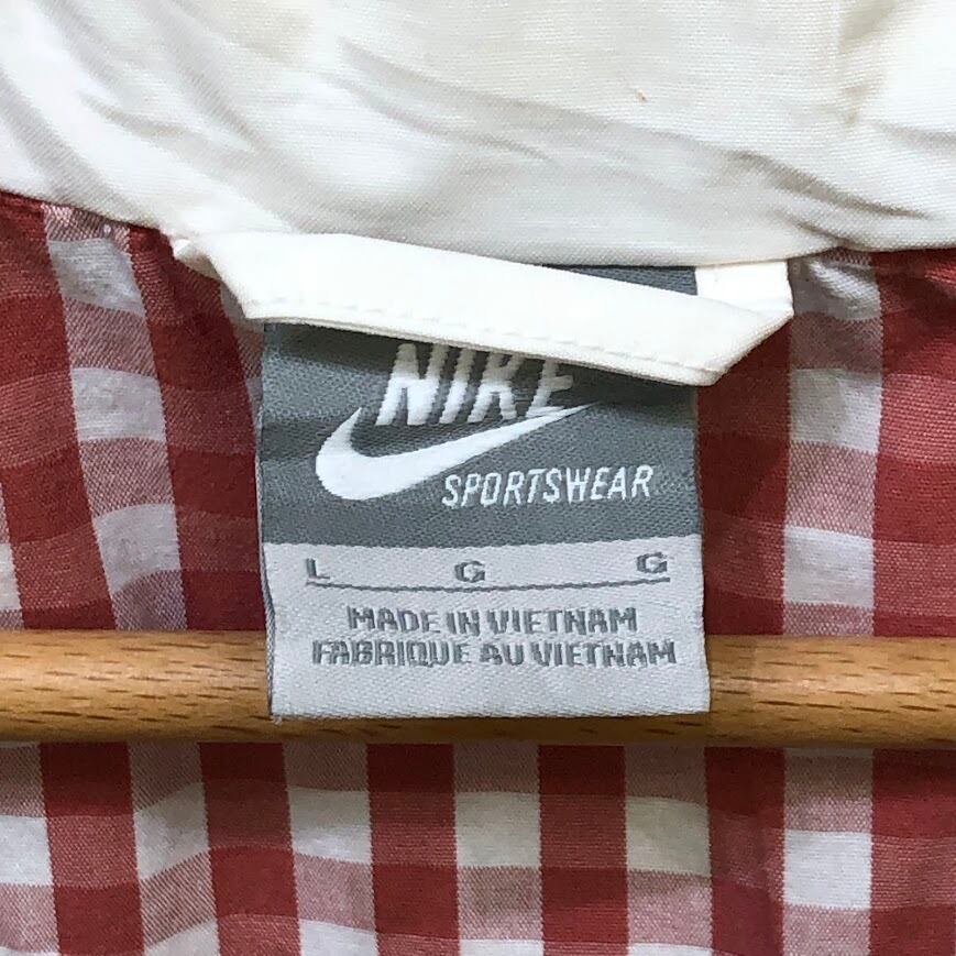 商品名:NIKE ナイキ TC FFF M65 ナイロンジャケット ウィンドブレーカー 裏地チェック フード収納 ドローコード フロント刺繍 アウター Vietnam製 Lサイズ ホワイト レッド