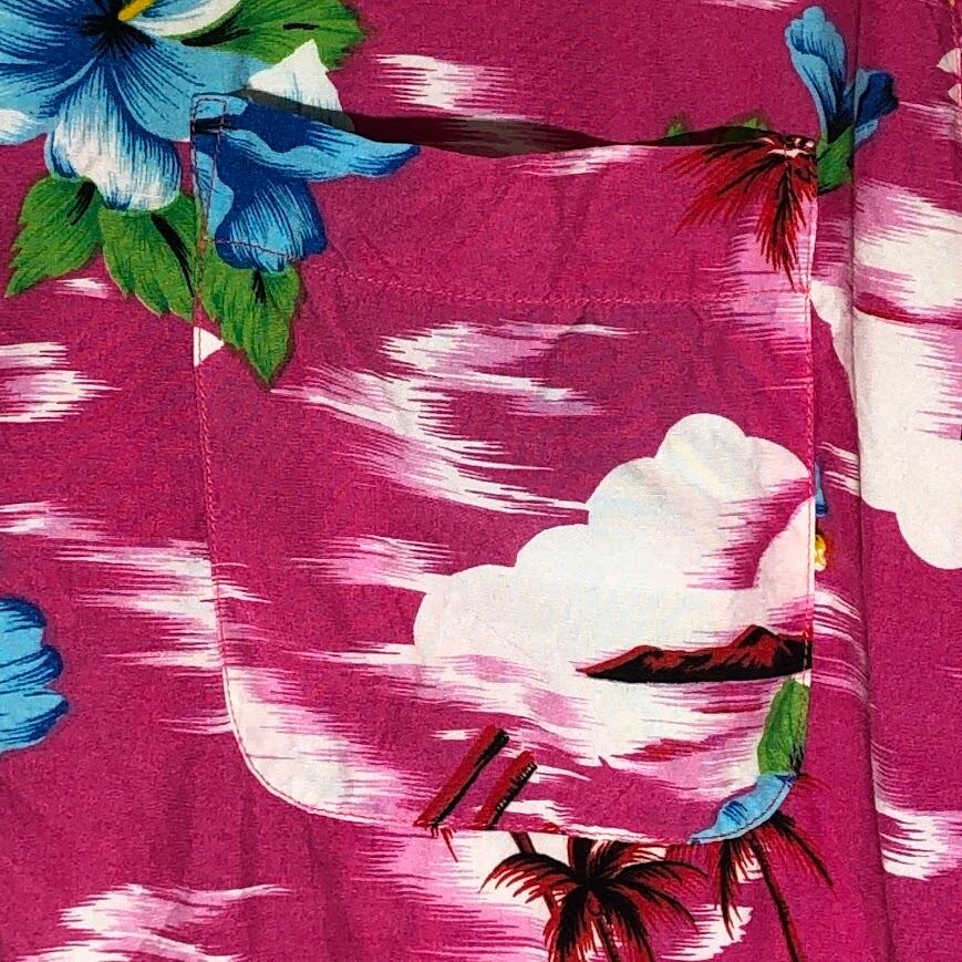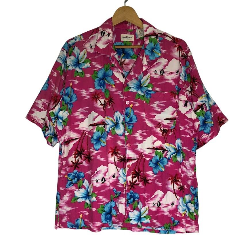 商品名:BOUVY PARIS NEW YORK アロハシャツ レーヨンシャツ ポケット ハイビスカス 半袖シャツ ボタンダウン China製 Lサイズ ピンク