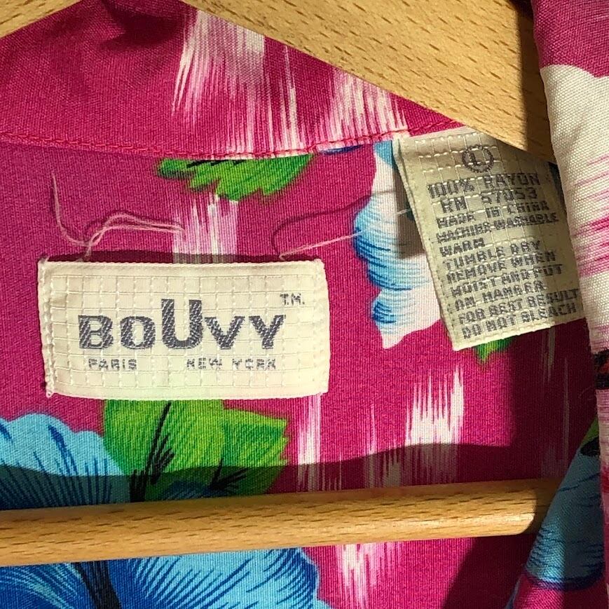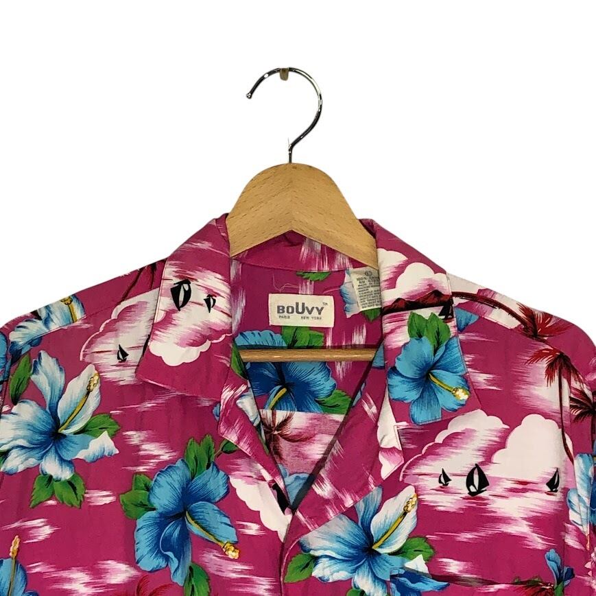BOUVY PARIS NEW YORK アロハシャツ レーヨンシャツ ポケット ハイビスカス 半袖シャツ ボタンダウン China製 Lサイズ ピンク