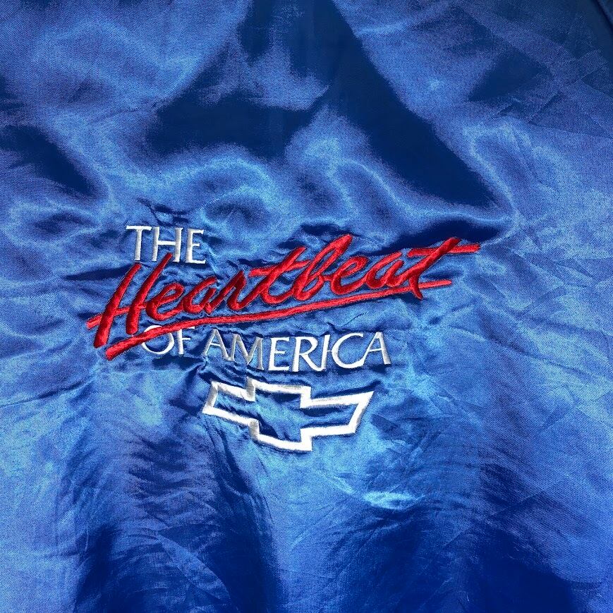 シボレー ハートビート 企業スタジャン ナイロンジャケット ヴィンテージ キルティングライナー 中綿 アウター バック刺繍 企業ロゴ刺繍 o- ビッグシルエット XLサイズ ブルー