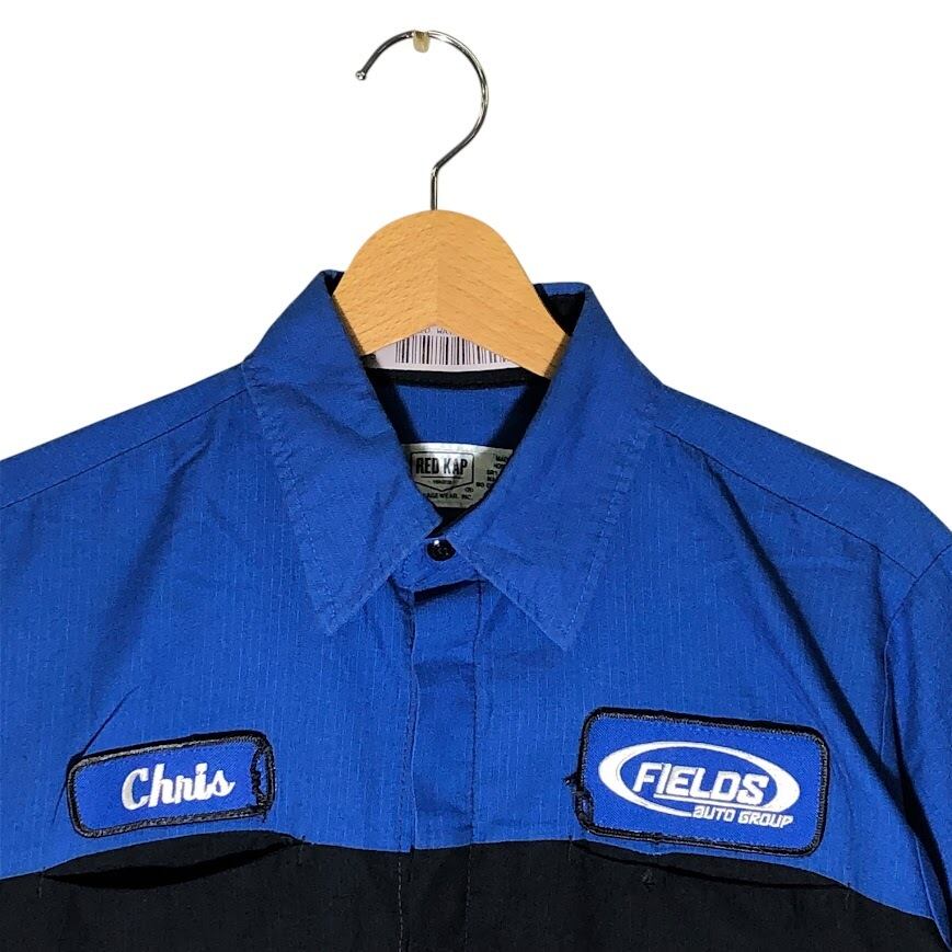 商品名:ヴィンテージ RED KAP FIELDS auto group Moper オートディーラー メカニック レッドキャップ ワークシャツ ダブルポケット 半袖 シャツ ボタンダウン 企業ロゴ刺繍 袖刺繍 HONDURAS製 Mサイズ ブルー ブラック