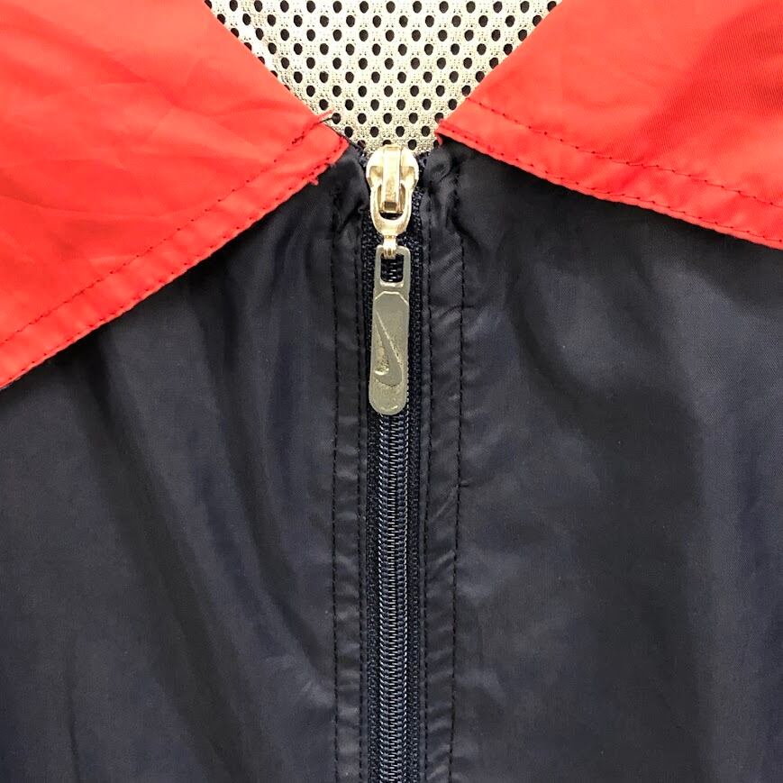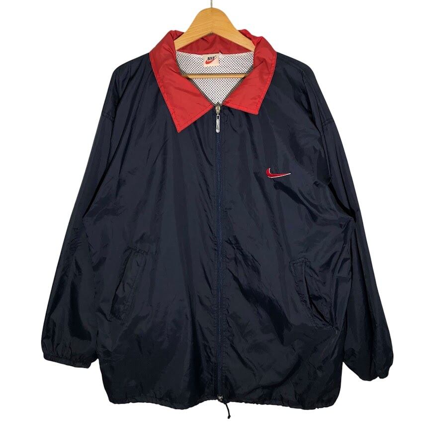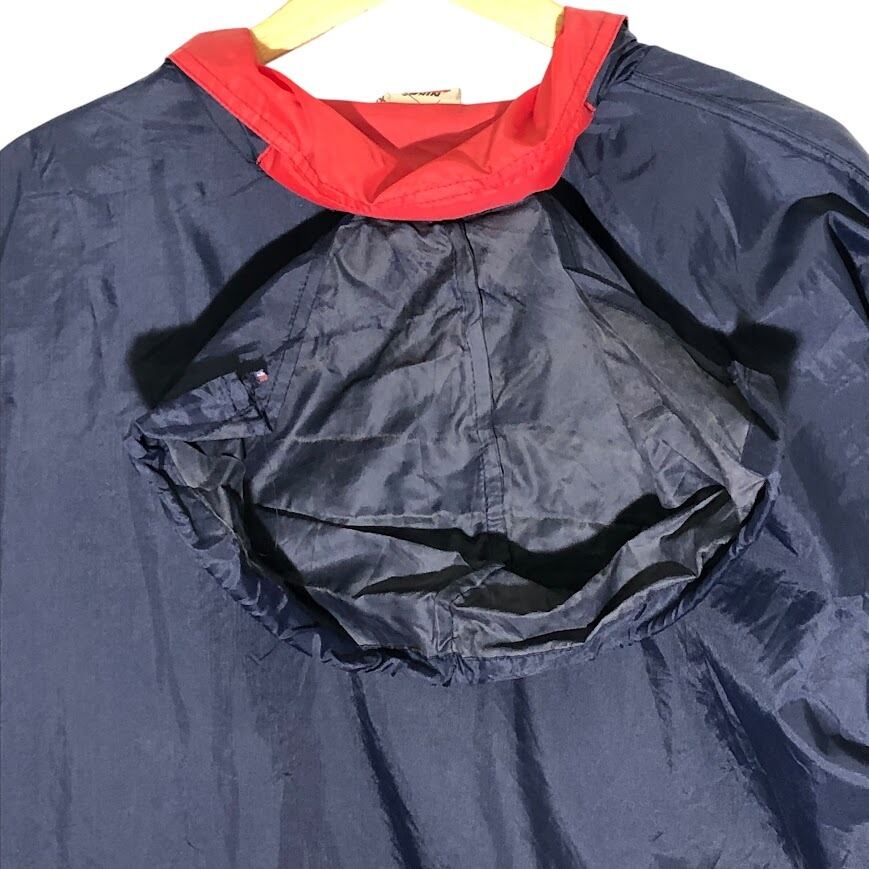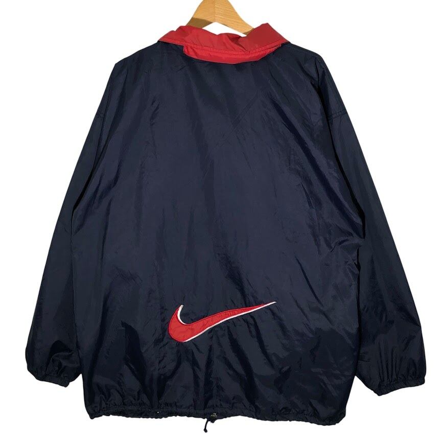 商品名:90年代/90’s ヴィンテージ NIKE/ナイキ 白タグ ナイロンジャケット フード収納 裏メッシュ ワンポイントロゴ刺繍 バックビックロゴ XLサイズ ネイビー/レッド