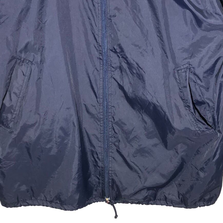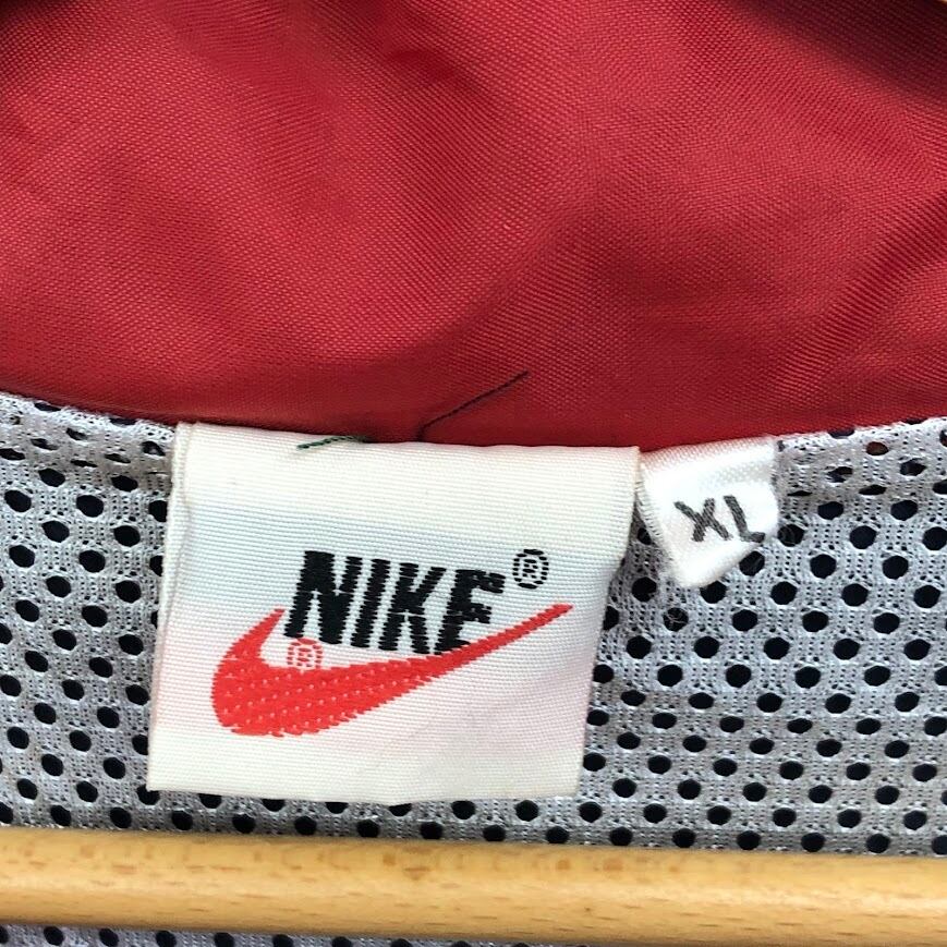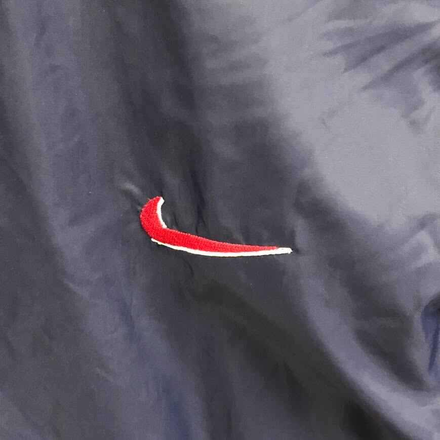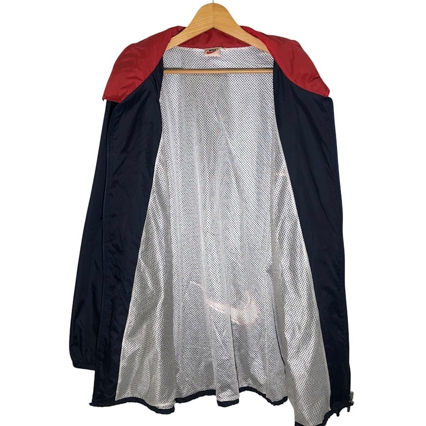 商品名:90年代/90’s ヴィンテージ NIKE/ナイキ 白タグ ナイロンジャケット フード収納 裏メッシュ ワンポイントロゴ刺繍 バックビックロゴ XLサイズ ネイビー/レッド