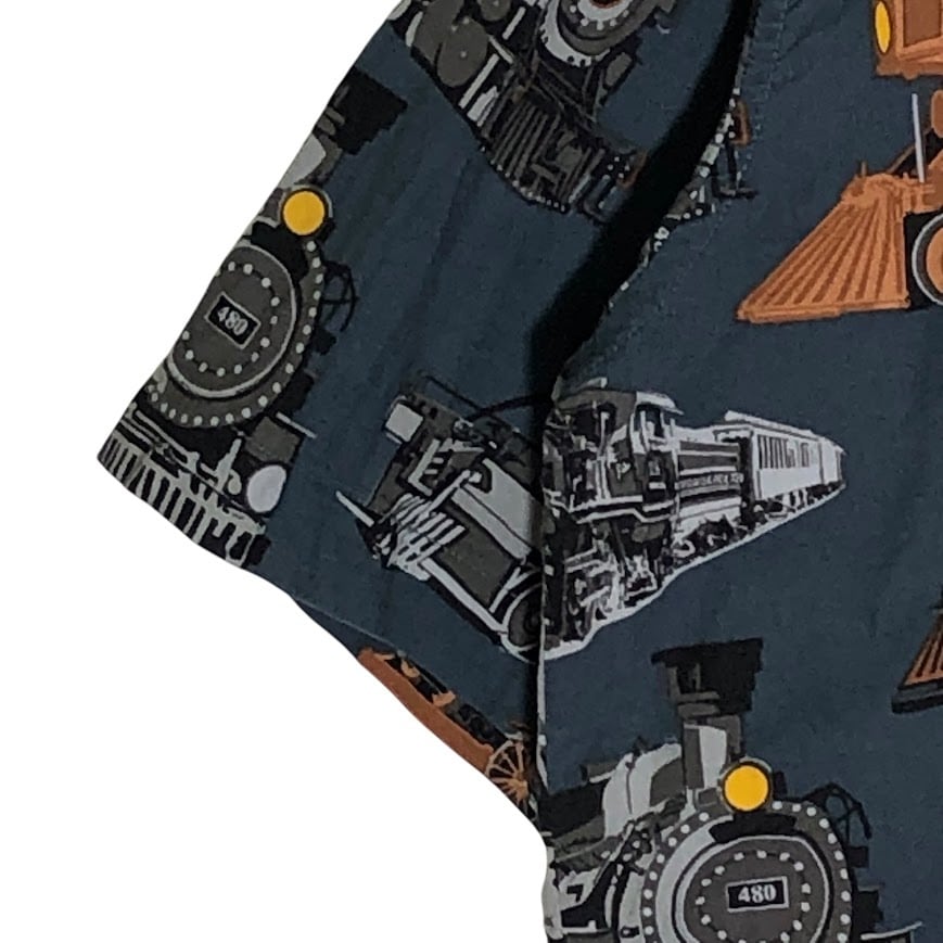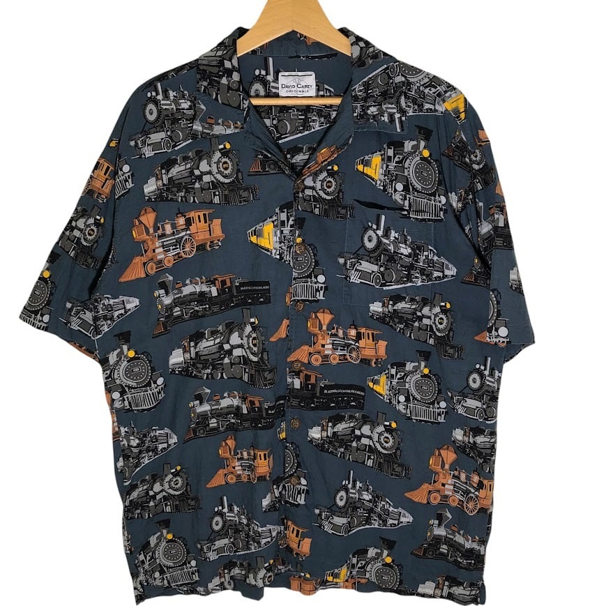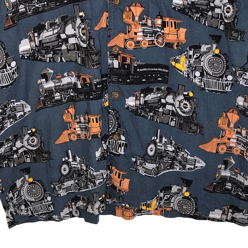 商品名:DAVID CAREY アロハシャツ 総柄 US古着 オープンカラー SL 機関車 半袖シャツ ボタンダウン オーバーサイズ ブルーグレー