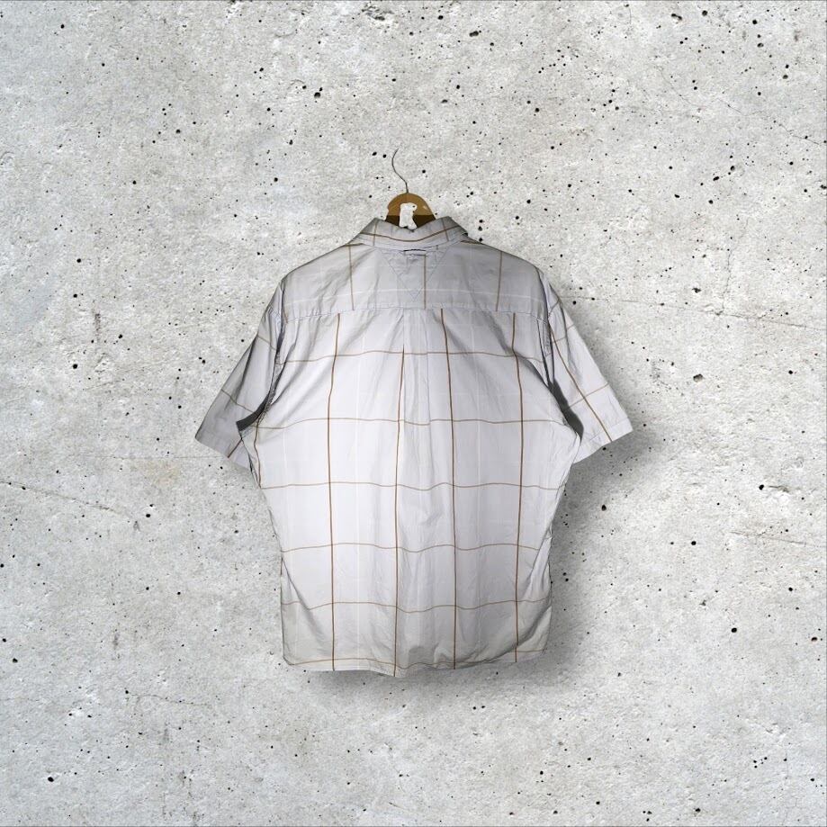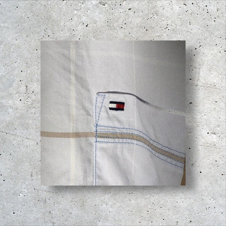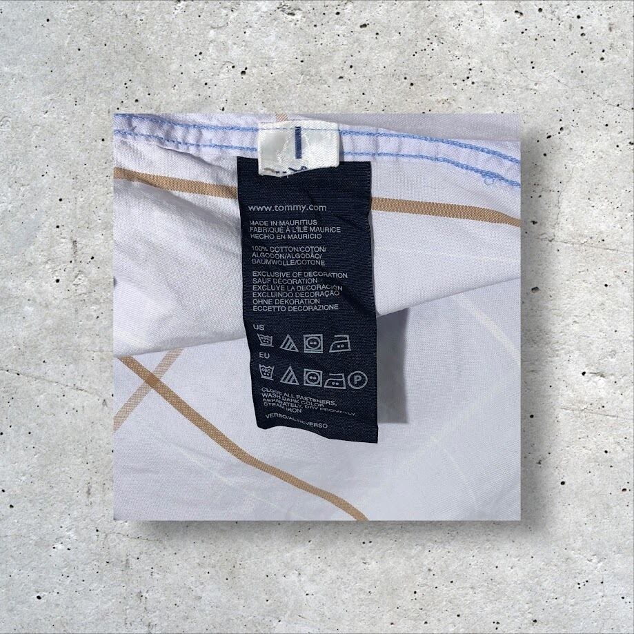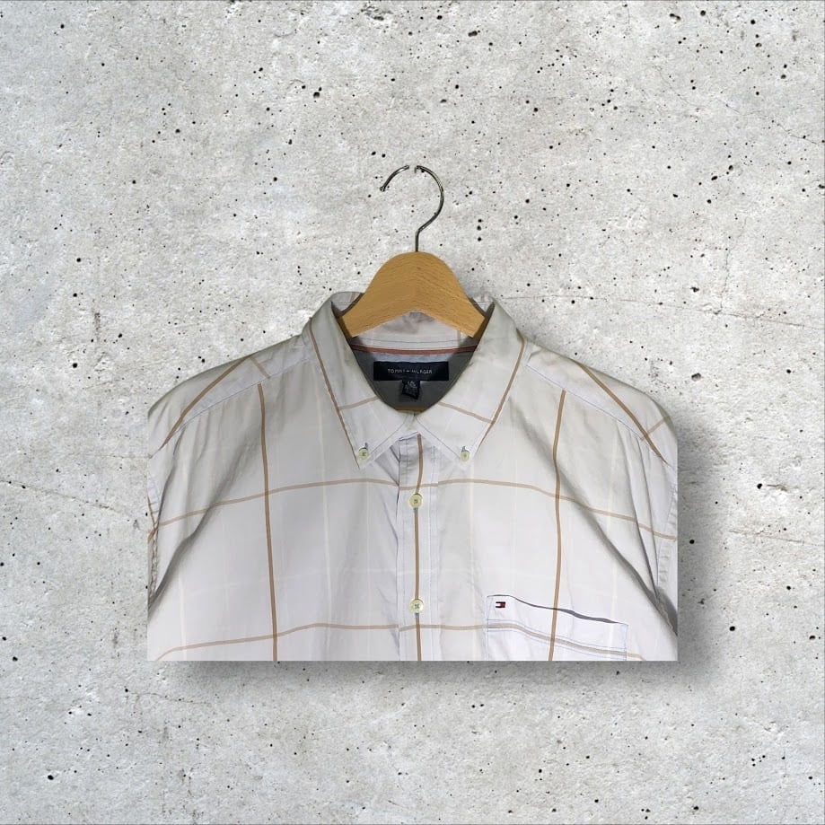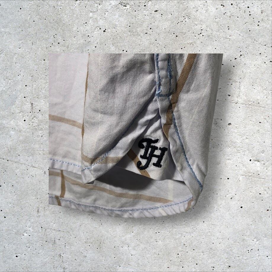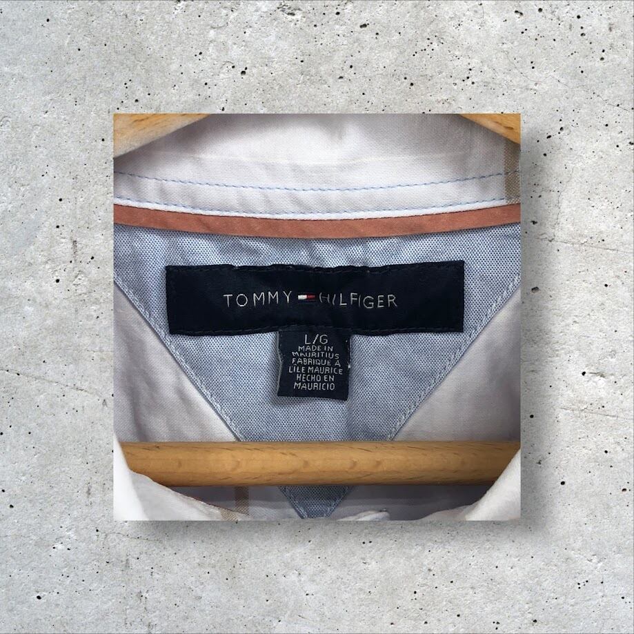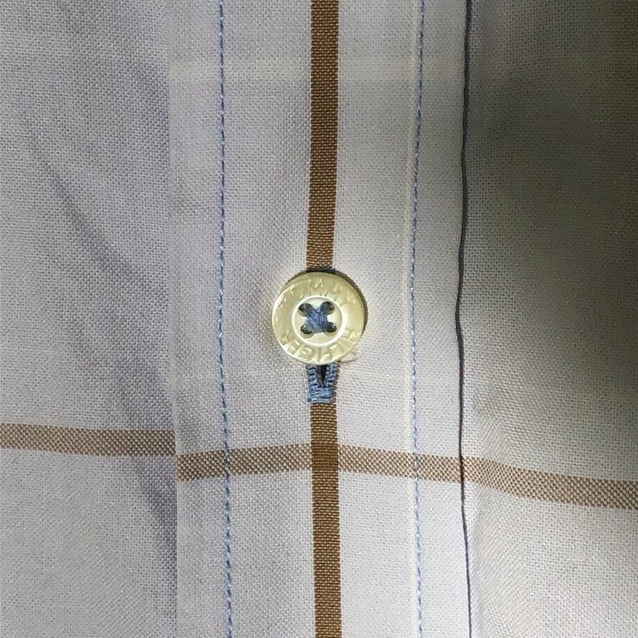 商品名:TOMMY HILFIGER トミーヒルフィガー チェック柄 フラッグロゴ 半袖 シャツ ボタンダウン ワンポイントロゴ刺繍 MAURITIUS製 Lサイズ ライトブルー ホワイト
