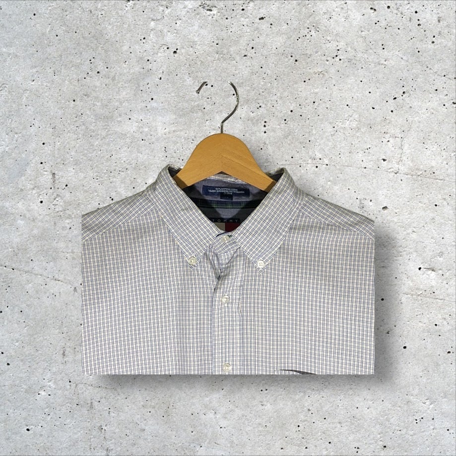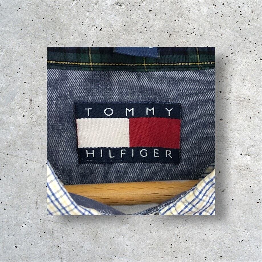 商品名:90`s vintage 90年代 ヴィンテージ TOMMY HILFIGER トミーヒルフィガー フラッグタグ チェック柄 長袖 シャツ オーバーサイズ ビッグシルエット 17 34-35サイズ ホワイト ブルー イエロー