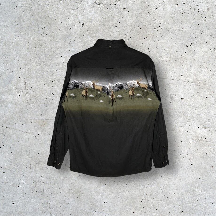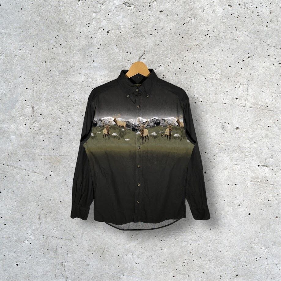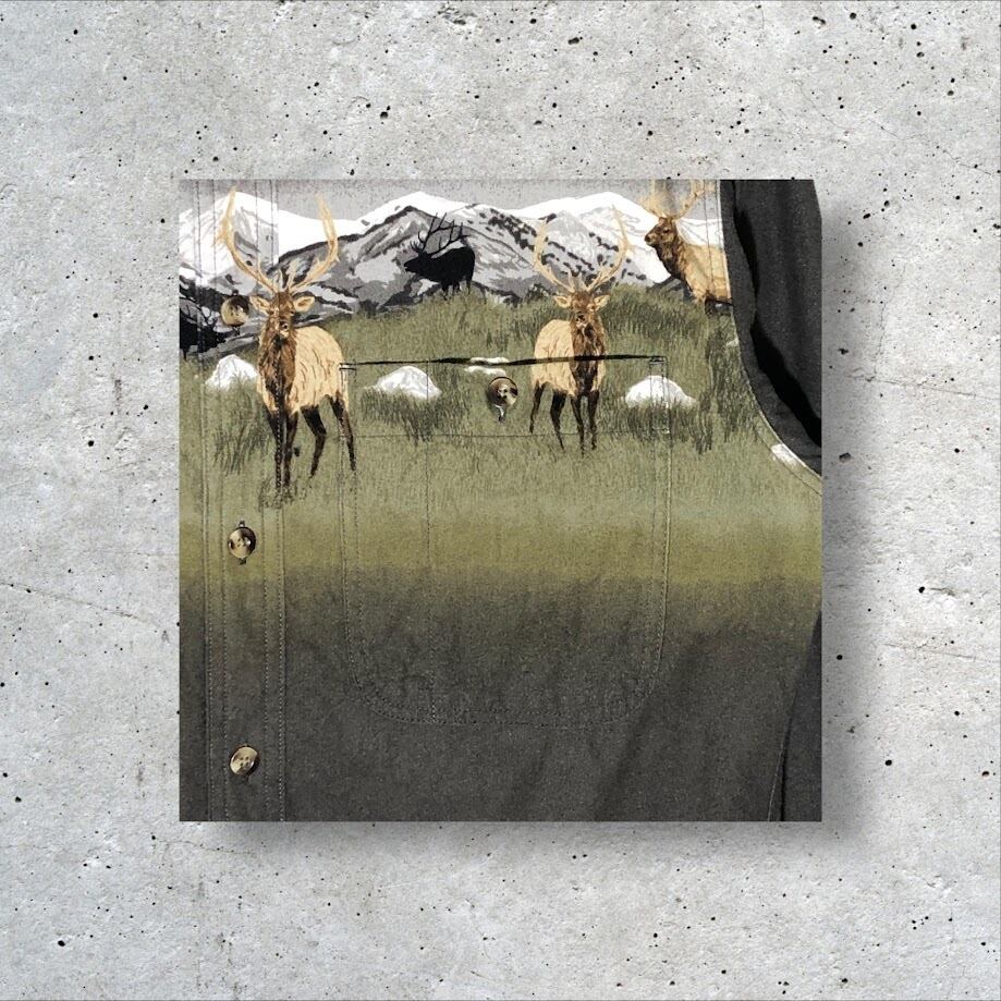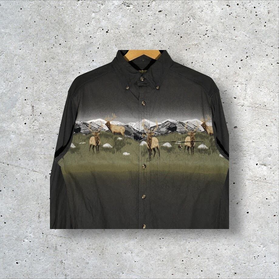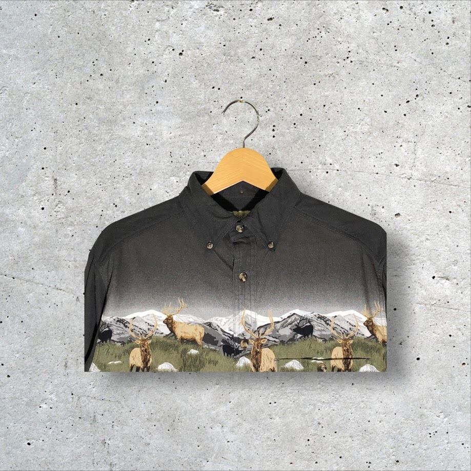 商品名:00's vintage 00年代 ヴィンテージ Cabela's カベラス DEERSKIN SOFT CHAMOLS シャツ 鹿プリント アニマル 長袖 シャツ ボタンダウン フロントバックプリント PERU製 Sサイズ ダークグレー