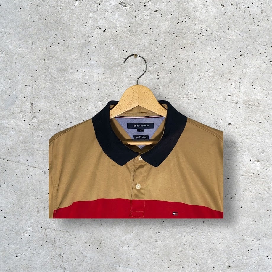 TOMMY HILFIGER トミーヒルフィガー SLIM FIT 半袖 ポロシャツ ライン ワンポイントロゴ Vietnam製 XLサイズ ブラウン レッド ホワイト