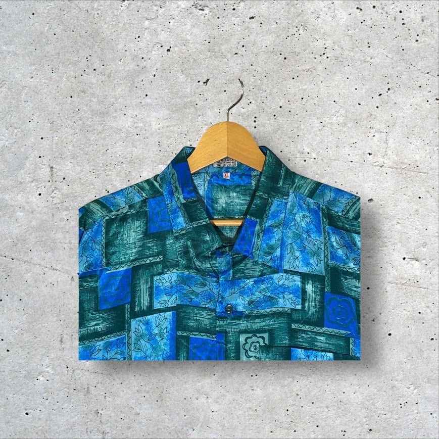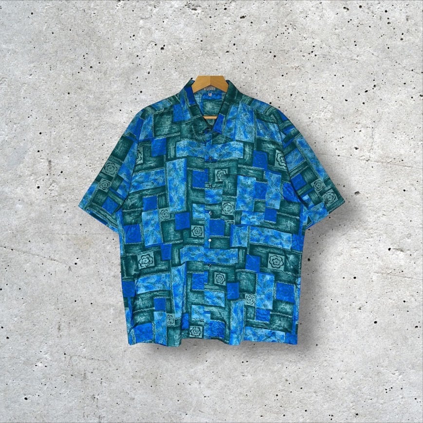 商品名:THAI SILK アロハシャツ ハワイアン 総柄 US古着 半袖 シャツ ボタンダウン オーバーサイズ ビッグシルエット THAILAND製 XLサイズ ブルー グリーン