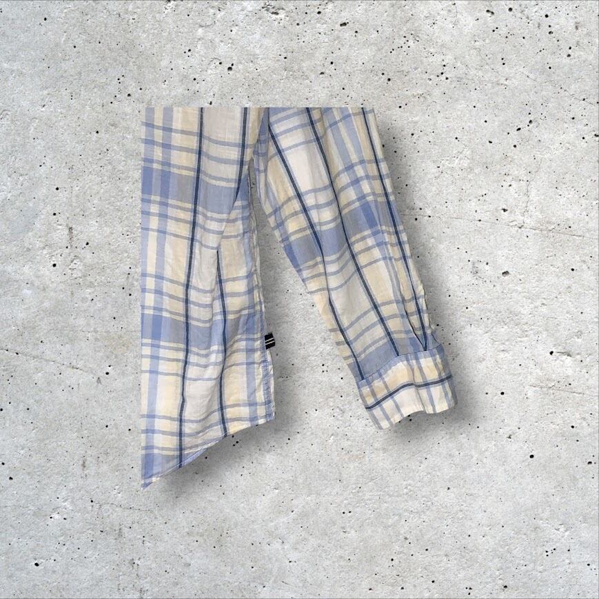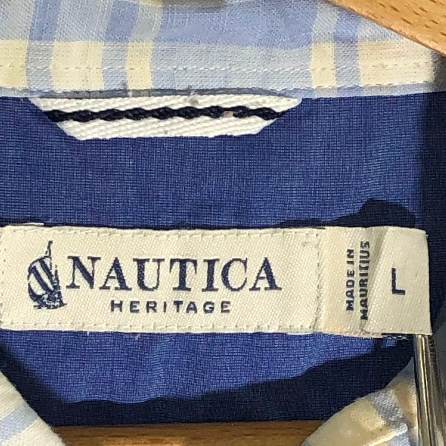 商品名:NAUTICA ノーティカ 長袖 シャツ チェック柄 ボタンダウン ワンポイントロゴ刺繍 MAURITIUS製 Lサイズ ライトブルー ホワイト ブルー