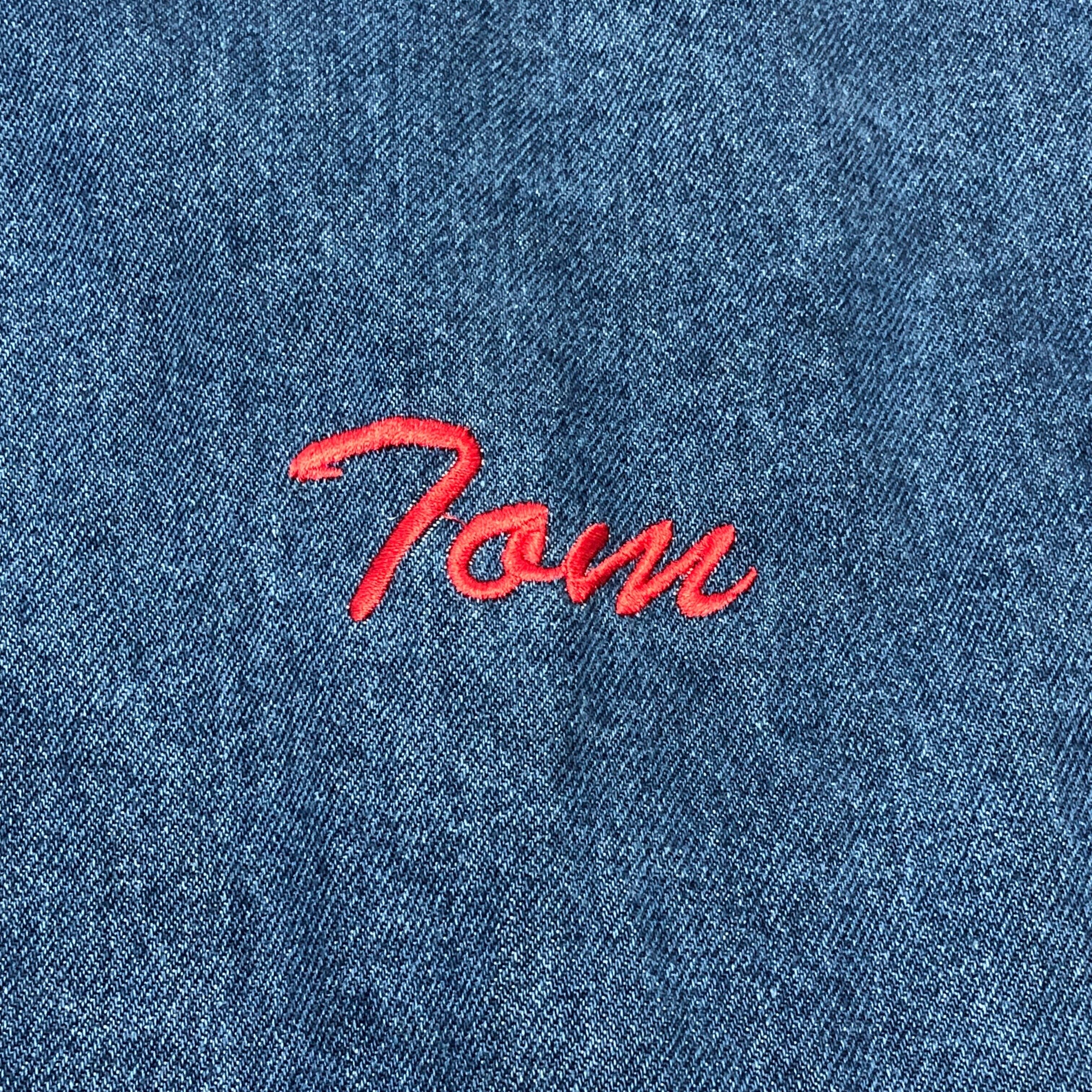 【商品名】Tri-Mountain 90's バッグ刺繍 デニムジャケット 90年代 バングラデシュ製 メンズL ベージュ/ブルー